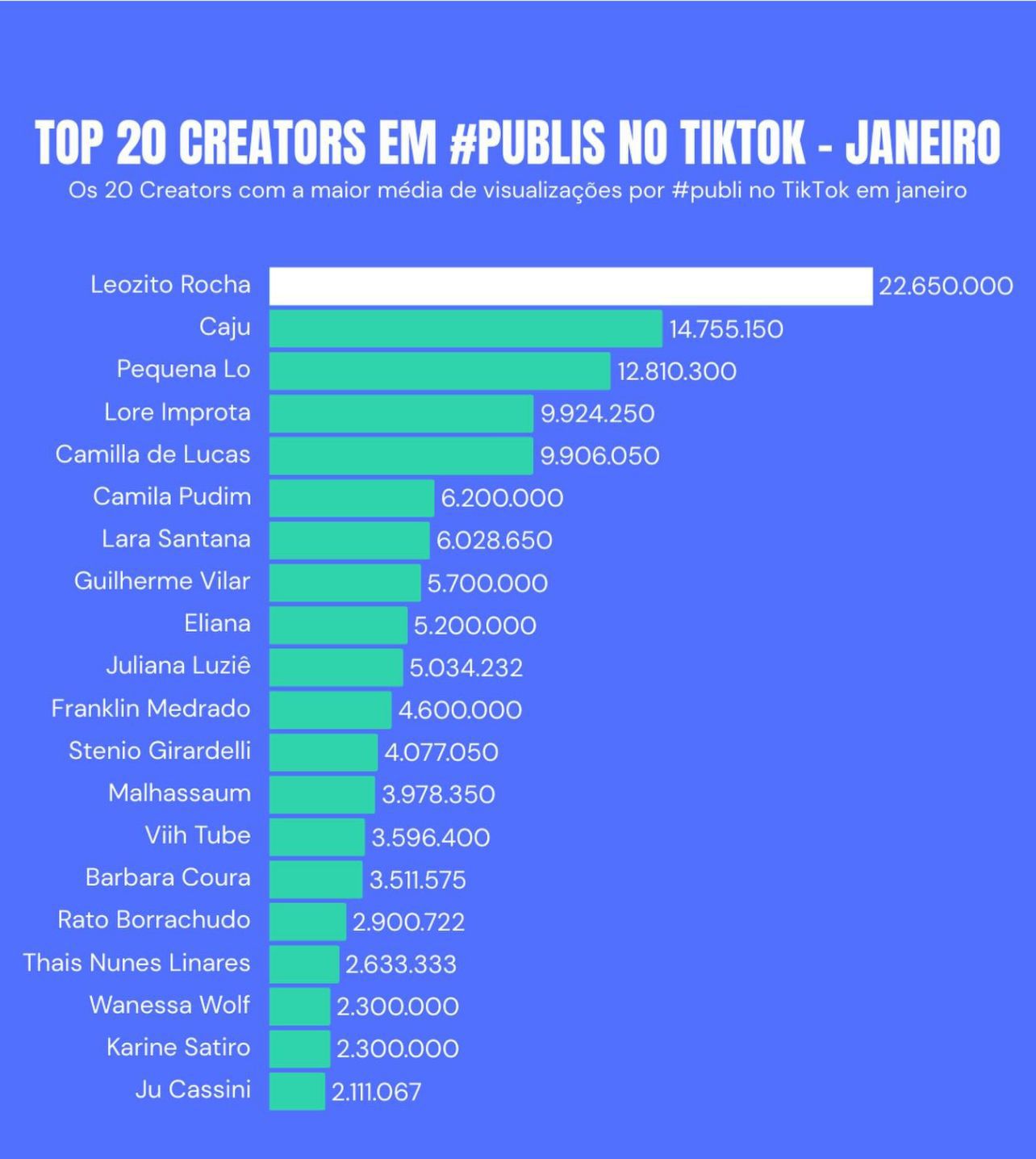 O levantamento foi feito pela Zeeng, empresa especializada em monitoramento e benchmark de redes sociais, e analisou a média de visualizações em conteúdos publicitários no TikTok durante o mês de janeiro. O critério é simples e pouco sentimental, performance real em post pago.